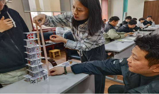 潘雅雯老师以“寓教于乐,知行合一”为理念,在活动中精心设计了四个特色环节。在创意实践环节,潘老师用“扑克牌高塔挑战赛”点燃现场热情。各小组在限定时间内,通过团队协作搭建创意高塔,这一环节体现出团队协作与创新思维的重要性。