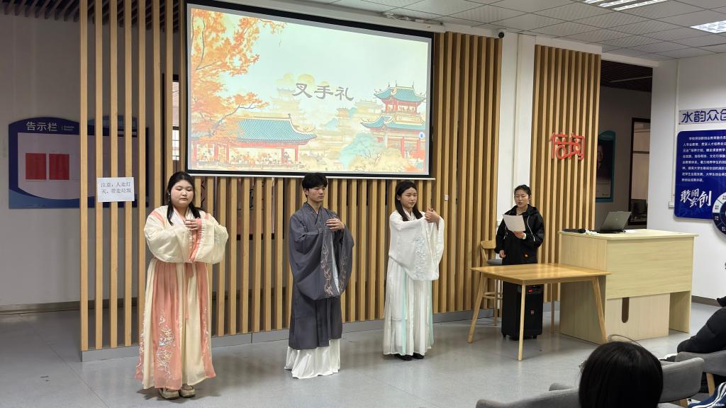 学院团总支学生干部身着汉服演绎了古代叉手礼、抱拳礼、作揖礼等古代儒家学派常用礼仪,分享了“孔融让梨”等经典礼仪故事,生动诠释了中华礼仪文化的深厚底蕴。