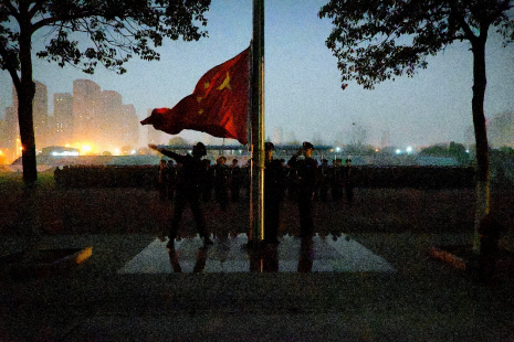 “正步走!”随着一声令下,国旗护卫队身姿挺拔、步伐刚健,护送五星红旗稳步迈向升旗台。“升国旗!奏唱国歌!”激昂雄壮的国歌声划破寂静。鲜艳的国旗迎着新年的曙光,缓缓升起。