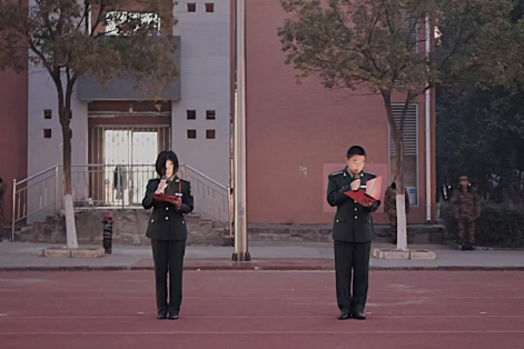 学员代表张永志、徐婉婷在国旗下发表主题为“强军报国,不忘初心,赓续传承红色基因”的演讲。