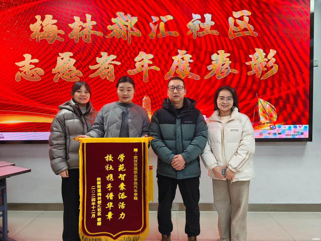 新闻网讯(通讯员 马琼)12月27日,在汉阳区梅林都汇社区举行的志愿者年度表彰会上,汽车学院团总支书记马琼接过梅林都汇社区党委书记陈雄送来的锦旗。