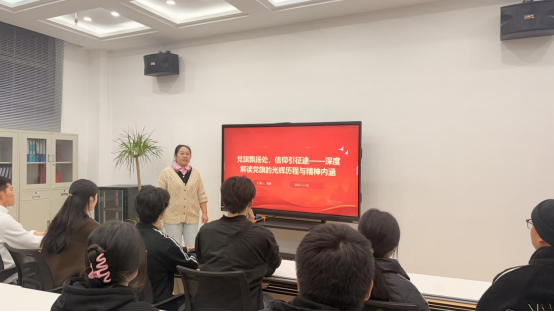 第三学生党支部书记梅慧以“党旗飘扬处,信仰引征途”为主题为同学们授了党课。梅老师从党旗的起源与历史、党旗在不同时期的作用、党旗下的英雄人物、党旗的传承等方面带领同学们深度解读了党旗的光辉历程和精神内涵。她强调:“新时代青年要勤奋学习奠定坚实的理论基础,提升专业技能;服务社会,锻炼实践能力;主动弘扬优良传统,传承红色基因;深入了解党的历史和文化,增强对党的认同感和归属感。”