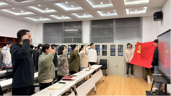 第二学生党支部和第三学生党支部正式党员为新发展的预备党员佩戴了党徽,全体党员、预备党员面向党旗进行了庄严的宣誓。