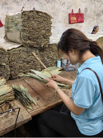 第二站,实践团前往当地箬叶打包制作厂参观学习。走近工厂大门时,大家已经闻到了箬叶的清香。进入厂房,看见20多个五、六十岁的阿姨,在产房里有条不紊地分拣箬叶。我们从阿姨口中了解到,这份工作不仅离家近,工作之余能够照顾家里,而且工资还能补贴家用。据悉,箬叶厂老板为了解决阿姨们就业,放弃了使用全自动机器拣选,仍然保留人工分拣,这里箬叶纯野生、防腐功效强,市场认可度特别高。