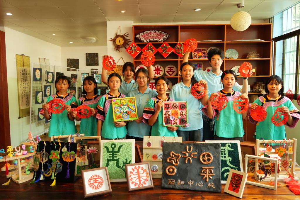 阳和小学地处都匀水族文化发源地潘硐村。近年来,学校立足本地优秀民族文化,将水书、水族“夺咚”、水族剪纸等优秀传统文化引入校园。实践团在学校老师的带领下欣赏了由当地水族群众和学生共同制作的水书字画、水族服饰、水族乐器等非遗作品,体验了富有水族特色的民族乐器“夺咚”,共同演奏了一段民族团结的和谐之歌。