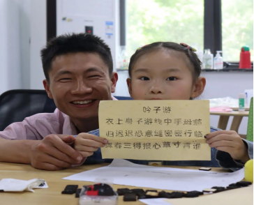 在体验环节,小朋友们纷纷成为“小小印刷匠”,在志愿者和家长的细心指导下,将一个个字模按照诗词顺序进行排版,接着涂墨﹑铺纸﹑按压…不一会儿,一张张字迹清晰、墨香袭人的印刷作品便呈现在大家眼前。