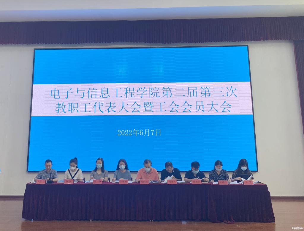 新闻网讯(记者 朱婧)6月7日下午,电子与信息工程学院顺利召开第二届第三次教职工代表大会暨工会会员大会,副校长梁世翔、学校工会专职副主席王丽莉、电子与信息工程学院领导及全体教师参会。会议由学院分工会主席沈卫文主持。