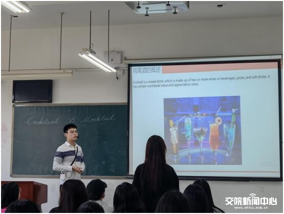 王老师讲授的课程是《酒水与酒吧服务》,当天讲授的知识点为“鸡尾酒概述”。王老师流畅的英语、精美的花体英文字板书、颜色鲜艳的鸡尾酒图片使得课程生动而富有吸引力。在讲解cocktail与mocktail的区别时,同学们踊跃举手用英语发言和讨论,将课堂的氛围推向了高潮。最后王老师以人物故事为例,向同学们强调了调酒师的工匠精神和职业道德。