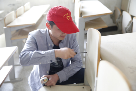 活动中,志愿者小组分工明确,各司其职。为避免遗漏存在故障的课桌,志愿者们认真检查、仔细维修。桌子太矮了,螺丝钉拧不上,志愿者就匍匐在地,用力的拧紧;椅子有晃动的,志愿者拧好后试坐看椅子是否稳固。2个小时的维修时间里,志愿者们善始善终,不留余力地热情奉献,共修缮400多张课桌、700多张抽屉板。
