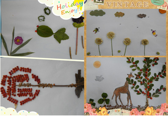 参赛作品由秋季各种颜色的落叶、树干、果实等天然材料组成,经过个人的加工与巧妙设计,成为了一幅幅精美的艺术作品,包括倡导人们敬爱生命的《梅》;关注绿色环保的《天空下的绿色》,充满奇幻色彩的《和蒲公英一起飞》等,创意十足。