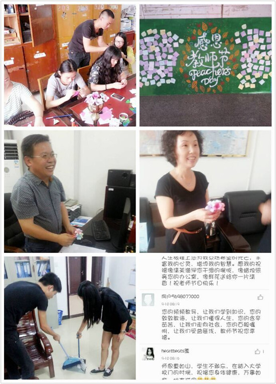 9月10日,学院各班级派学生代表向老师送上了亲手制作的百合花;自发清扫教师办公区;制作精美的教师节板报;通过微博、微信、QQ群向老师们传递了同学们“最想对老师说的一句话”。