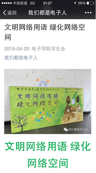 (周贝贝)4月16日,电子与信息工程学院在我校食堂、宿舍及教学楼区发起“文明网络用语,绿化网络空间”活动,将网络文明标语粘贴到教室、宿舍、校园宣传板上,通过制作专题宣传板,张贴标语,通过微信、微博、QQ等新媒体宣传、倡导网络文明。
