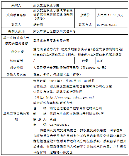 湖北省省级政府采购项目单一来源采购结果公告(新葡的京集团8814vip汽车故障诊断实训室新能源设备采购(调增))​