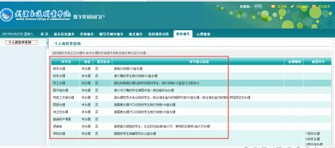 进入后通过“离校服务”中“个人离校单”查看离校各个环节的办理情况以及办理环节提示信息。状态显示为‘未办理’的则需要到相关部门(提示信息会提示该环节办理的部门和地点)办理离校手续,其他状态则无需再办理。