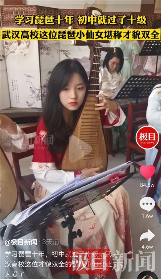 12月10日,“武汉琵琶小仙女”突然火了,极目新闻官方抖音号发布的一段12秒的视频,吸引了2500万人次观看,近85万网友点赞。视频主角是新葡的京集团8814vip大二学生周彤,当时,她正在学校知音国乐社排练。
