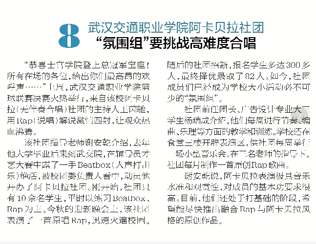 【楚天都市报】武汉高职有了阿卡贝拉社团,“氛围组”要挑战高难度合唱