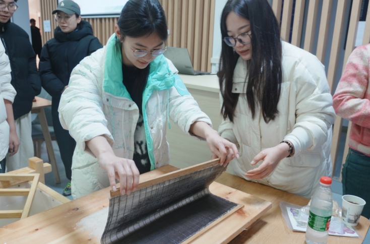 同学们在纸坊造纸技艺非遗守护人王旭的指导下体验抄纸工艺。纸浆在竹帘上均匀铺展,脱水后纸面斑驳的纤维见证着千年技艺在新时代校园焕发的蓬勃生机。“触摸温润纸浆的瞬间,仿佛能听见历史长河里的匠心跳动。”刘金宏同学感慨道。