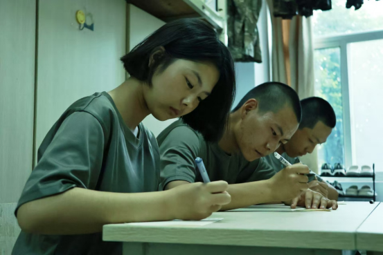 “家书书写角”的长桌前,同学们有序围坐:有的低头沉思,将军训中的苦与乐凝于笔尖;有的时而停顿,眼里充盈激动的泪水,继续写下对家人的牵挂。